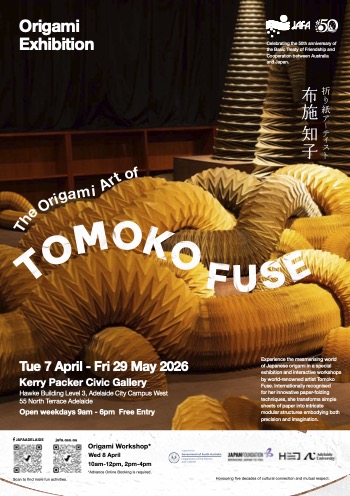 The Origami Art of Tomoko FuseAs part of Celebrating the 50th anniversary of the Basic Treaty of Friendship and Cooperation between Australia and Japan. Experience the mesmerising world of Japanese origami in a special exhibition and interactive workshops by world-renowned artist Tomoko Fuse. Internationally recognised for her innovative paper-folding techniques, she transforms simple sheets of paper into intricate modular structures embodying both precision and imagination. When and WhereTue 7 April - Fri 29 May 2026 Kerry Packer Civic Gallery Origami WorkshopsBeginner to IntermediateWednesday 8 April, 10am - 12pm, Bradley Forum, Hawke Building Introducing essential folding techniques and patterns, ideal for beginners and those wishing to build confidence. Cost $50, Origami Workshop with Tomoko Fuse (Beginner – Intermediate) Tickets AdvancedWednesday 8 April, 2pm - 4pm, Bradley Forum, Hawke Building Introducing complex structures, precision folding, and sculptural approaches, ideal for experienced practitioners. Cost $50, Origami Workshop with Tomoko Fuse (Advanced) Tickets Exhibition Poster
